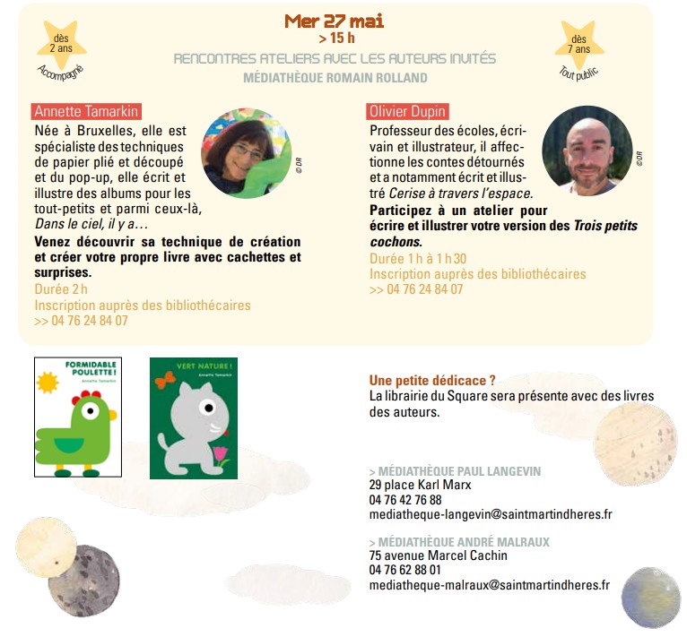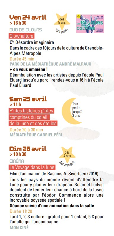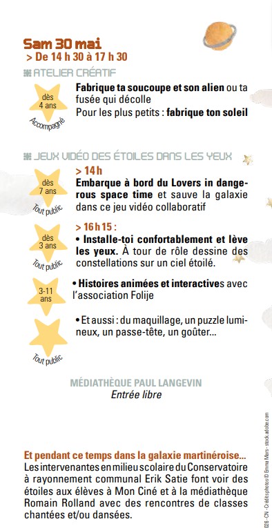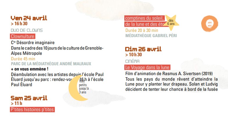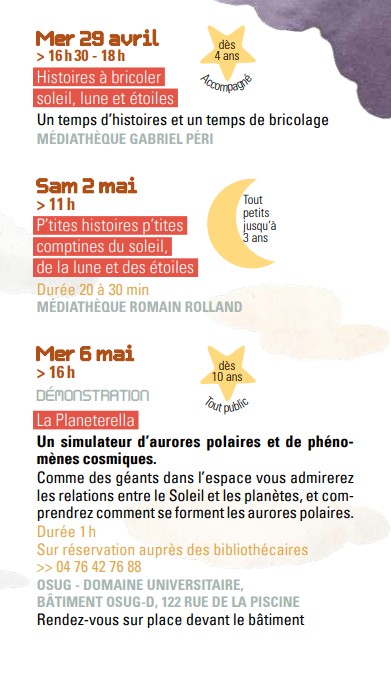 AU BONHEUR du SOLEIL 🌞 et de la LUNE et des ETOILES 🌜 du 24 avril au 30 mai dans les 4 médiathèques et 🚀 ailleurs… Publié le Posted on 2 avril 20262 avril 2026 Partager de vendredi 24 avril 2026 à samedi 30 mai 2026 Planifié Médiathèque espace Paul Langevin29 place Karl Marx, 38400 Saint-Martin-d'Hères Carte Feuilleter le programme AU BONHEUR DU SOLEIL 🌞 DE LA LUNE 🌛 ET DES ETOILES ✨ Pour les enfants et leurs familles du 24 avril au 30 mai 2026 dans les 4 MEDIATHEQUES et 🚀ailleurs… AU BONHEUR du SOLEIL 🌞 de la LUNE 🌛 et des ETOILES ✨ Un évènement annuel autour du livre jeunesse, qui s’adresse aux enfants (de 0 à 99 ans) et à leurs familles, dans les médiathèques et🚀ailleurs… 🌟 En complicité avec les équipements culturels – Conservatoire Erik Satie, Mon Ciné, l’Espace Vallès / Artothèque et Saint-Martin-d’Hères en scène – les Maisons de quartier – au service de tous les arts, cinéma, musique, danse, théâtre, peinture, sculpture, bande dessinée… www.biblio.sitpi.fr 🪐 Et pendant ce temps dans la galaxie martinéroise… Les intervenantes en milieu scolaire du Conservatoire à rayonnement communal Erik Satie font voir des étoiles aux élèves à Mon Ciné et à la médiathèque Romain Rolland avec des rencontres de classes chantées et/ou dansées.