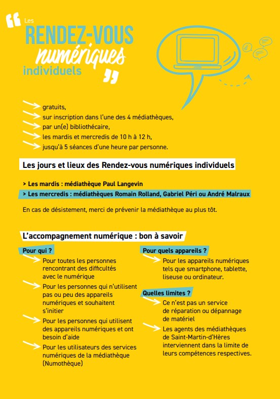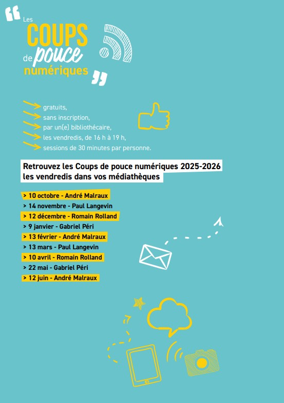 [De oct. 2025 Ă juin 2026] COUPS DE POUCE NUMERIQUES 👍 Gratuit – Ă la MĂ©diathèque PubliĂ© le Posted on 4 novembre 20254 novembre 2025 Partager vendredi 14 novembre 2025 de 16h00 Ă 19h00 PlanifiĂ© ActualitĂ©s ActualitĂ©s raccourcis articles Appel Ă participation Enfance Équipements Famille Lecture Lecture MĂ©diathèque MultimĂ©dia Pratiquer Sortir MĂ©diathèque Paul Langevin 29 place Karl Marx, 38400 Saint-Martin-d'Hères Carte PROGRAMME Accompagnement numĂ©rique dans votre mĂ©diathèque Besoin d’aide avec vos appareils numĂ©riques ? Les bibliothĂ©caires sont lĂ pour vous ! VOUS AVEZ LE CHOIX : 🎯 Coups de pouce numĂ©riques ✔️aide ponctuelle ✅ 30 min/pers. // gratuit et sans inscription 🎯 Rendez-vous numĂ©riques individuels ✔️initiation ou perfectionnement âś… jusqu’à 5 h/pers. // gratuit et sur inscription MĂ©diathèque - Infos pratiques