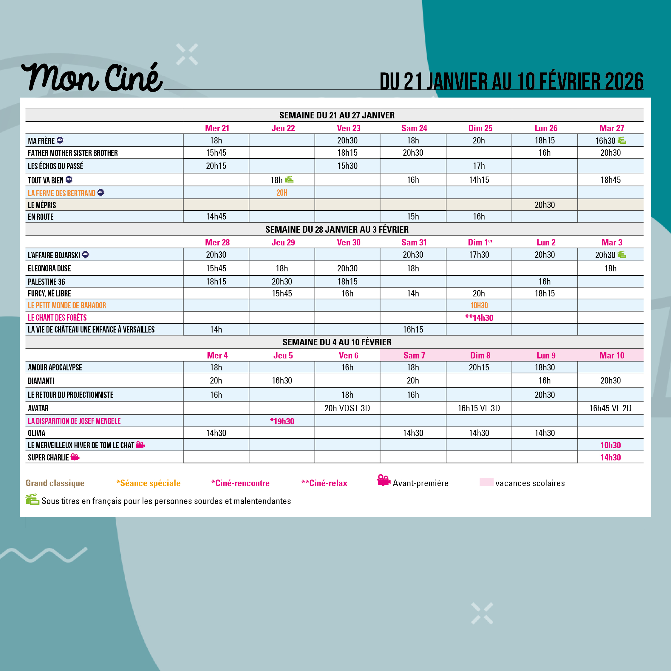 Le programme de MON CINÉ du 21 janvier au 10 février 2026 Publié le Posted on 13 janvier 2026 Partager mercredi 21 janvier 2026 Planifié Actualités Actualités raccourcis articles Appel à participation Ciné-débat Ciné-ma différence Ciné-matinée Cinéma Éducation artistique Enfance Équipements Famille Jeune public Jeunesse Mon Ciné Pour les petits Pratiquer Scolaires Sortir Mon Ciné, 10 avenue Ambroise Croizat, 38400 Saint-Martin-d'Hères Carte À L'AFFICHE ! Téléchargez Infos pratiques et Tarifs Newsletter