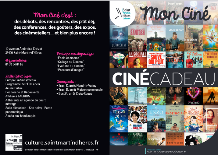 Le programme de Mon Ciné du 24 décembre au 20 janvier Publié le Posted on 22 décembre 202522 décembre 2025 Partager Bienvenue en famille à Mon Ciné ♿ Pour les fêtes offrez des places de cinéma 🎁 Info 04 76 54 64 55 moncine@saintmartindheres.fr 👀 Les films à L’AFFICHE 📖 Le programme ℹ️ Le cinéma sera fermé le 25 décembre. Toute l’équipe vous souhaite de belles fêtes de fin d’année 🌟