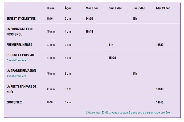 [Pour les Tout-Petits] FESTIVAL TROIS PETITS PAS AU CINEMA 🎬Les 3, 6, 7 et 23 déc. 2025 🐭🎄🐻 à Mon Ciné Publié le Posted on 20 novembre 202520 novembre 2025 Partager 💜 Tarif enfant 🎟️ 4€ 💜 Tarif unique adulte et enfant (séance de moins d’1h) 🎟️ 3,50€ Mon Ciné Info & Réservation 04 76 54 64 55 Festival Trois petits pas au cinéma EN SAVOIR + Des histoires tendres, drôles, légères et positives qui aborderont les thèmes du voyage, de l’émerveillement et de l’amitié. Nous adaptons le son et la lumière aux besoins des tout-petits pour ces premiers instants de cinéma. Les séances sont accompagnées et prolongées par des animations dans la salle de cinéma, quiz, coloriage, espace de lecture…. Cette édition se clôturera le lundi 23 décembre avec trois séances spéciales Noël à partager en famille, et parce qu’une journée de clôture ça se fête : venez costumé en votre personnage préféré ! Bienvenue en famille à Mon Ciné !